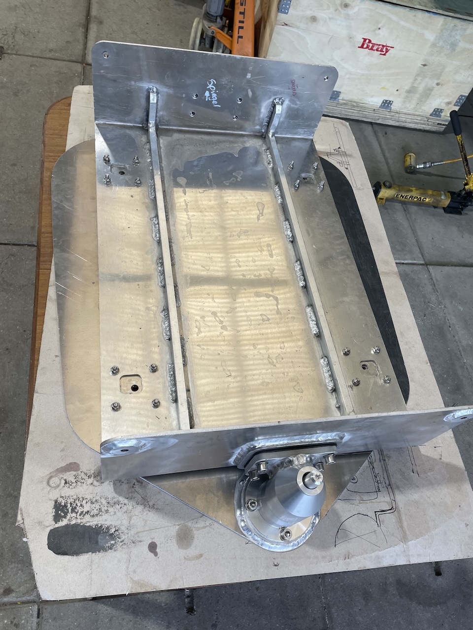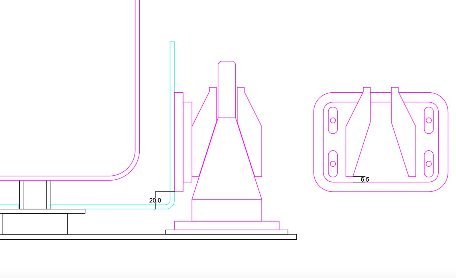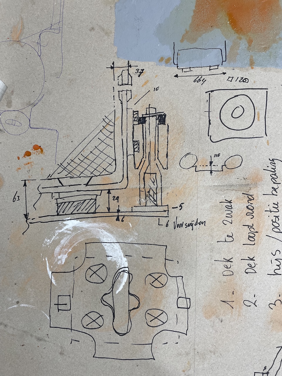 Het dek en de dekbalken van polyester zijn opgemeten en in AutoCad en met de bestaande tekening van de accukoffer werd duidelijk hoeveel bewegingsruimte er nog was en op welke hoogte de koffer bij het laten zakken opgevangen en gecentreerd moest worden om er zeker van rte zijn dat de dekbalken niet geraakt kunnen worden.