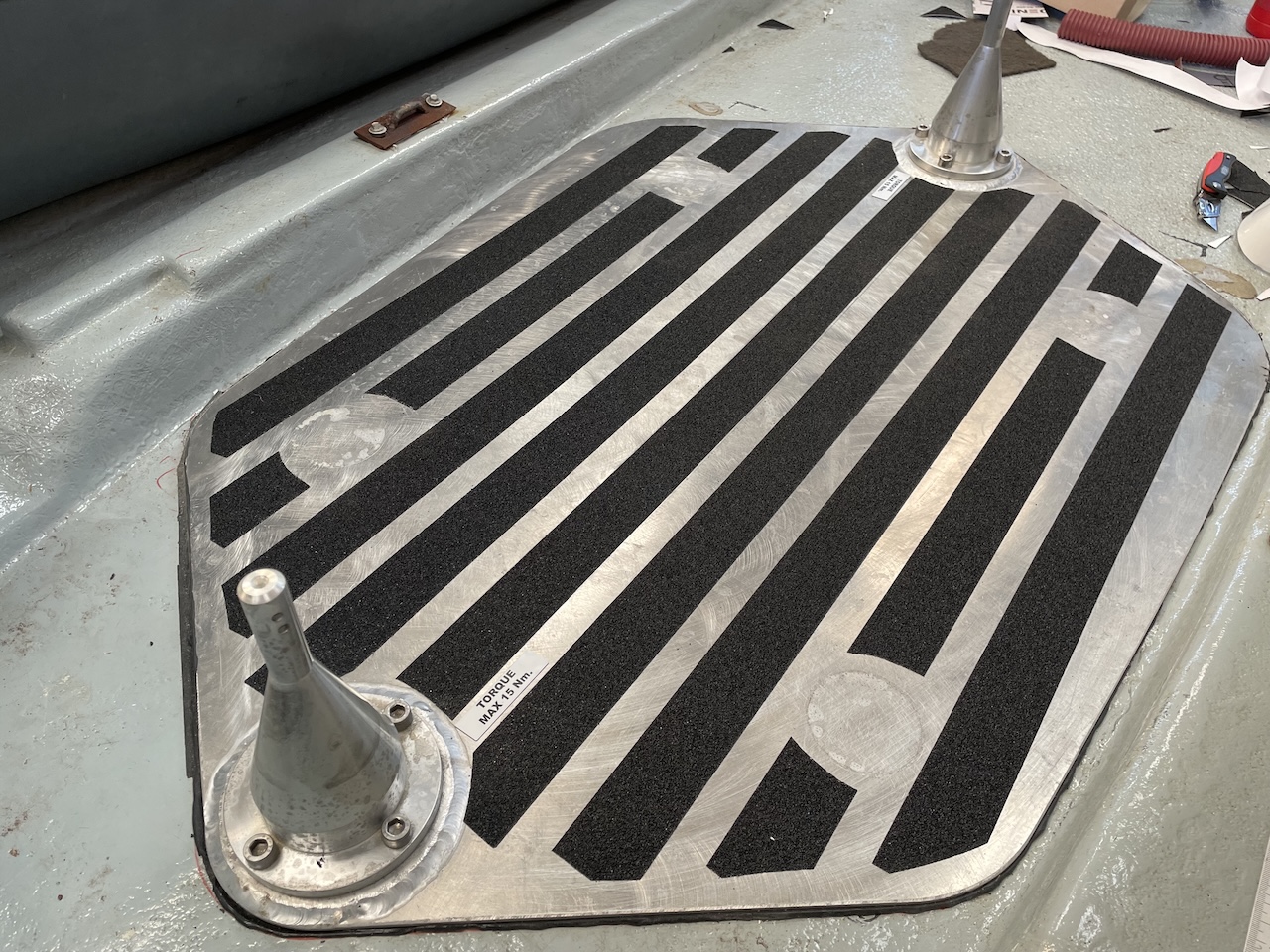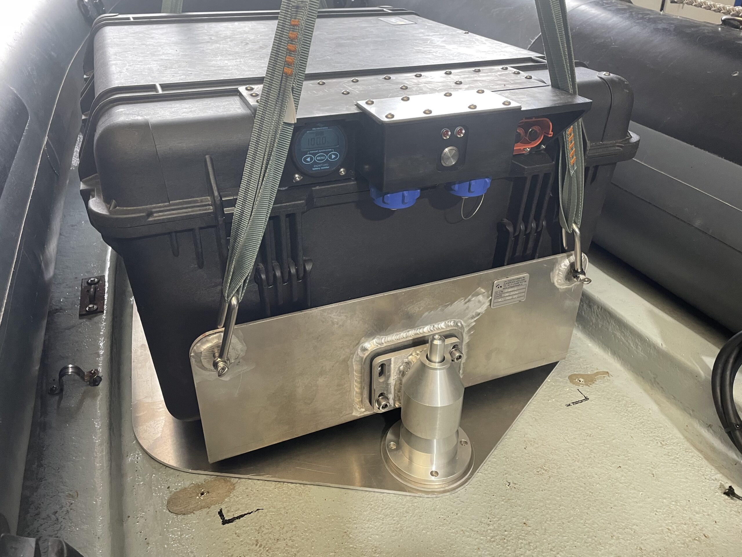 De dekplaat zorgt hierbij voor de verdeling van het gewicht en is de basis voor de centreer-pennen die hierop met flenzen vastgezet kunnen worden. De kans op schade bij het wisselen is hierbij ingeperkt en een haarspeld borgpen zorgt ervoor dat ook bij slecht weer en het springen over golven, de accukoffer goed geborgd blijft.